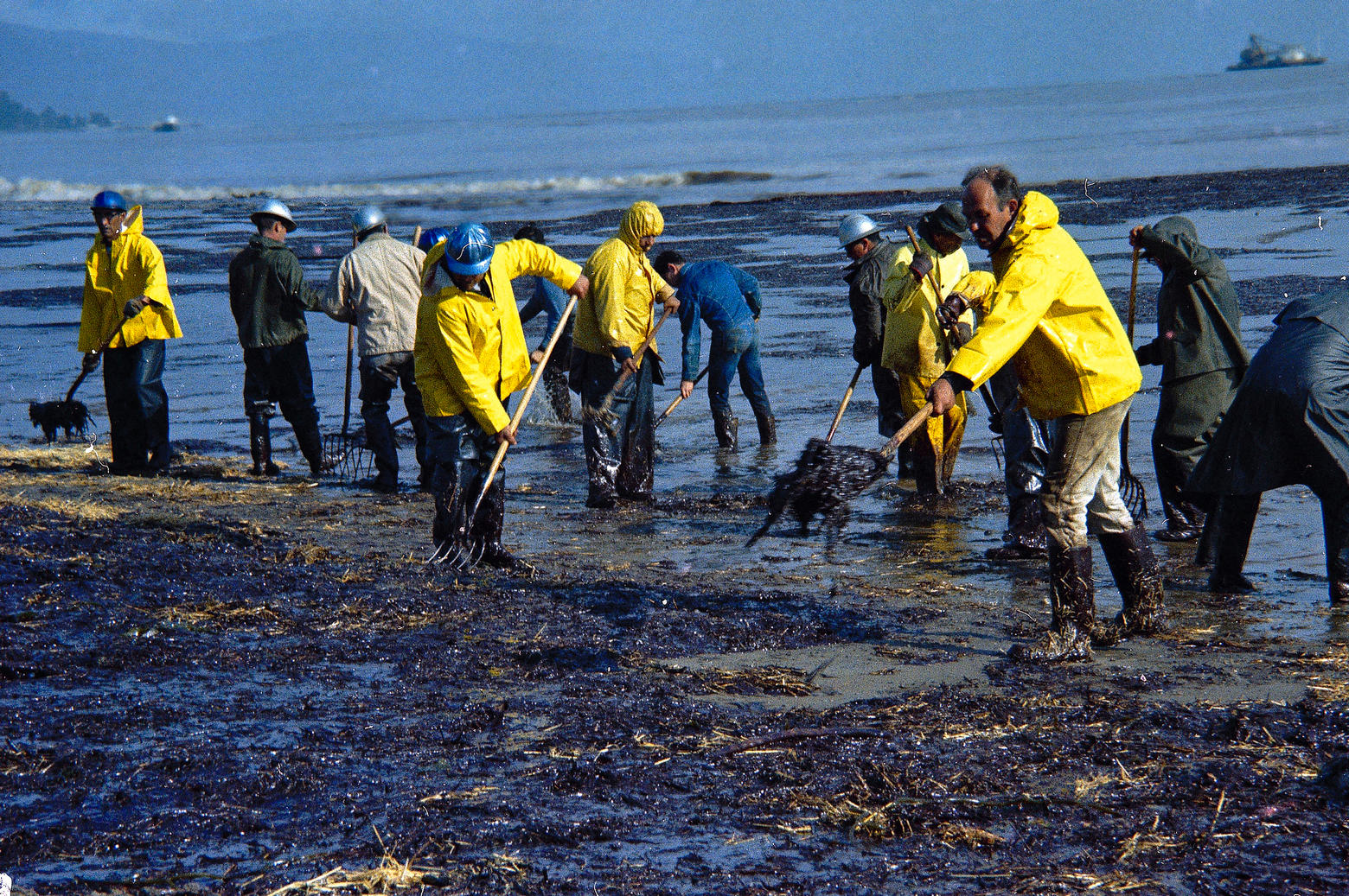 FILE- In this Feb. 6, 1969, file photo, state forestry conservation crews gather up oil-soaked straw on a beach in Santa Barbara, Calif. Fifty years after the first Earth Day helped spur activism over air and water pollution and disappearing plants and animals, significant improvements are undeniable but monumental challenges remain. Minority communities suffer disproportionately from ongoing contamination. Deforestation, habitat loss and overfishing have wreaked havoc on global biodiversity. And the existential threat of climate change looms large. (AP Photo/Wally Fong, File)