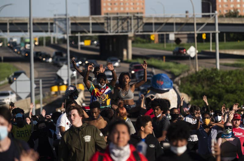 Protesters march down a highway off-ramp on May 28, 2020 on their way to Minneapolis, Minnesota.