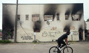 A man rides a bicycle past a burned out building Friday after a night of protests and violence in Minneapolis, Minnesota. Photograph: Scott Olson/Getty Images