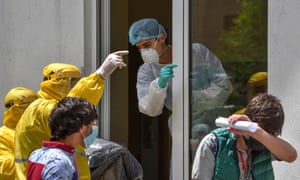 A hospital worker (C) wearing a protective face mask and outfit, speaks with two ambulance doctors wearing yellow protective suits at the Grigor Lusavorich Medical Centre in Yerevan amid the COVID-19 pandemic. Photograph: Karen Minasyan/AFP/Getty Images
