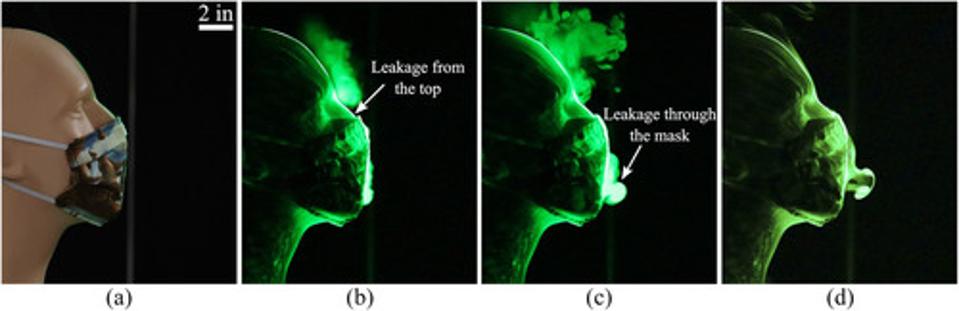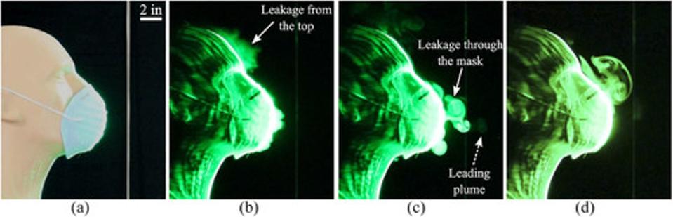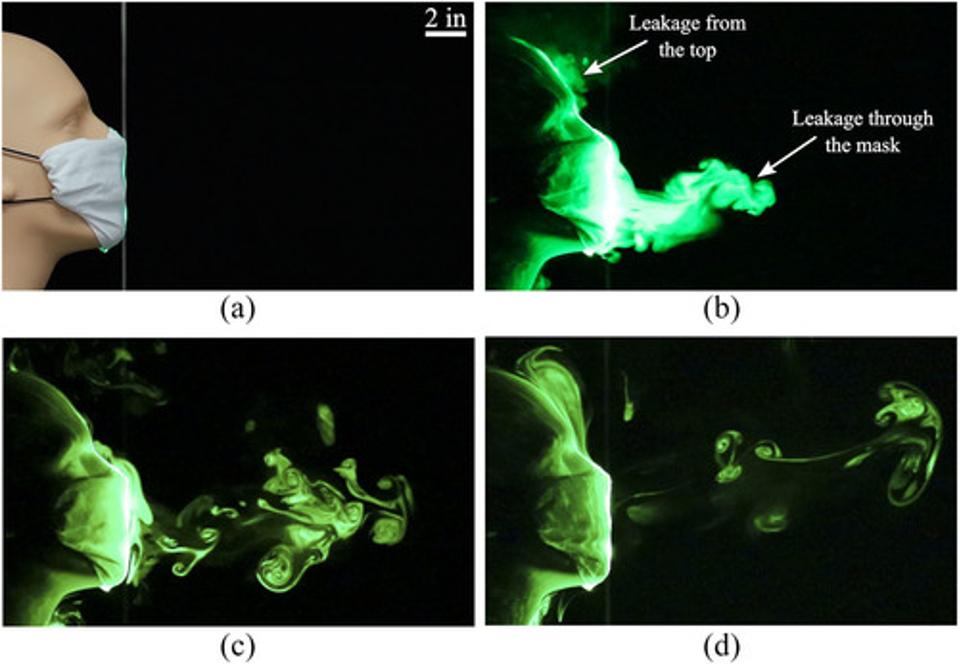 The team used a manikin (a medical mannequin) to model coughing and sneezing. The spray was replicated using a pump of water and glycerin solution (“respiratory jets”) paired with fog machine particles (“tracer particles”) to help visualize the activity. Lasers captured the behavior of the particles as they escaped the masks through gaps or the fabric itself. The team repeated the experiment with a variety of mask types—a bandana, a mask made from a folded handkerchief using instructions from the U.S. Surgeon General, a stitched mask made of two layers of quilting cotton, and a drugstore brand cone face mask.
