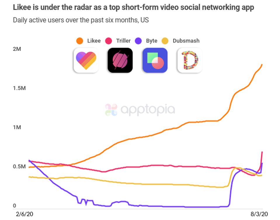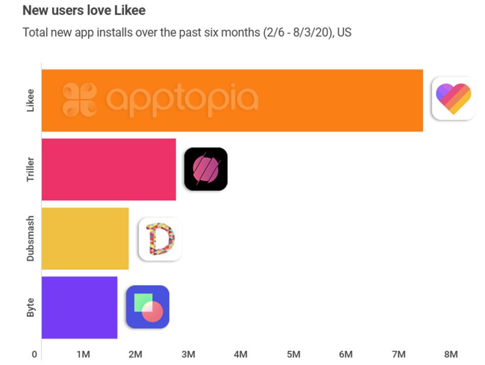 Likee has more new app installs over the last six months than Triller, Dubsmash, and Byte. APPTOPIA