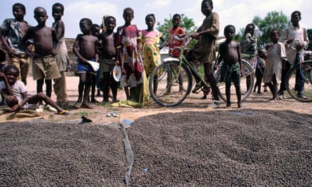 Cocoa beans drying in the sun, Ivory Coast. Hazardous work includes the use of sharp tools, working at night and exposure to agrochemical products. Photograph: Michael Dwyer/Alamy