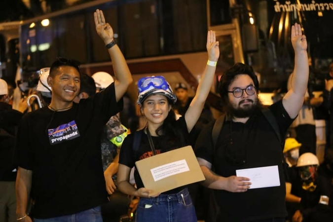 From left : Protest leaders Jatupat Boonpattararaksa, Passarawalee Thanakijwibulpol and Warin Patrick McBlain pose for a photo in front of the German Embassy in Bangkok during the pro-democracy rally on Monday. Photo Credit: Pai Jatupat FB.