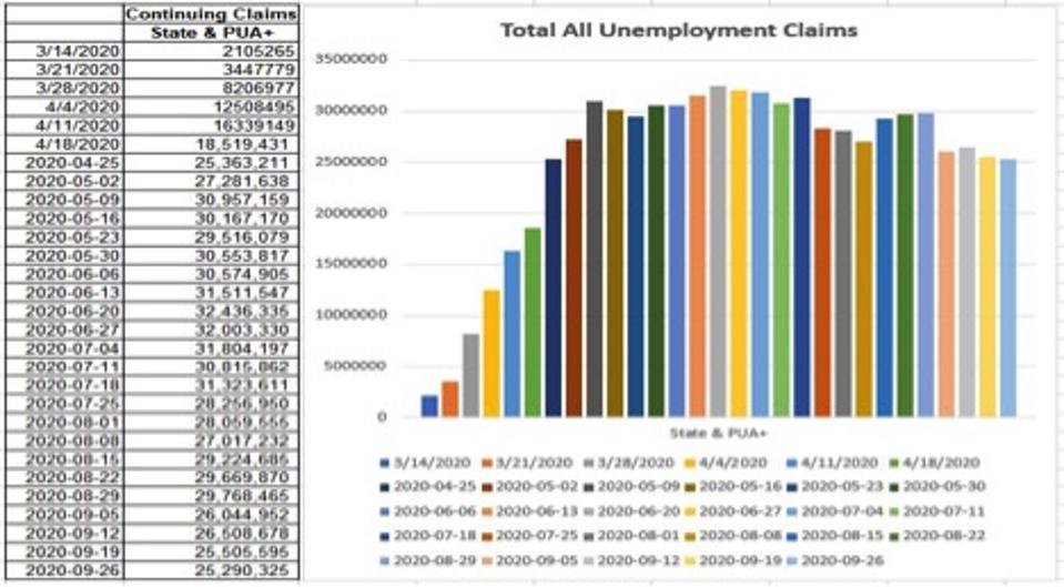 When the Continuing Claims (CCs) are added to the ICs as shown in the chart and table at the top of this blog, there remain more than 25 million unemployed. While the “official” U3 number is 7.9% for September, the “real” unemployment rate is in the 15%-20% range. The right-hand side of the chart shows that, while total unemployment is down from its 32 million peak in June, the improvement halted in September. The left-hand tail of the chart shows the much, much lower pre-virus norm.