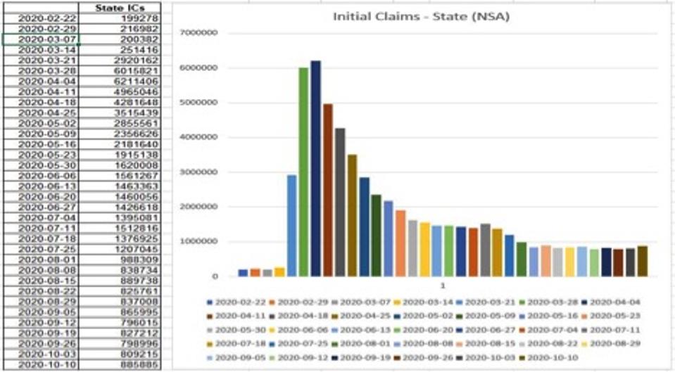 The accompanying table and chart of state ICs shows the flat to slightly rising right-hand tail. “Normal,” i.e., pre-virus, is shown in the left-hand tail. Let’s also remember that +885K ICs are new layoffs, most of which occurred in the prior week. Yikes! In addition, ICs under the CARES Act PUA program (Pandemic Unemployment Assistance – for self-employed, independent contractors, and gig workers) added another +373K. While the PUA ICs fell -91K from the prior week’s +464K level, when the state ICs and PUA ICs are added together, the result is a mind-blowing +1.26 million ICs for the week of October 10th. That’s 6.5 months after the initial shock.