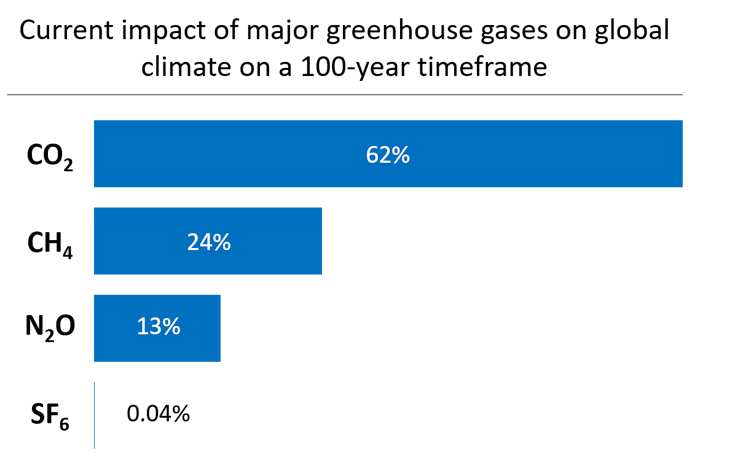 Measurements show that SF₆ has been increasing in the atmosphere. While SF₆ emissions across Europe have more than halved since the mid-1990s, global emissions are increasing, mostly owing to increases in SF₆ emissions from the electrical industry, which are predicted to continue. Even so, it’s important to put the role of SF₆ as a greenhouse gas into context with other greenhouse gases.