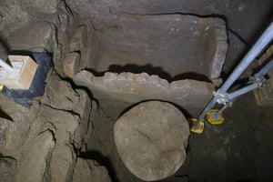 A 1.4-metre (55in) sarcophagus and what appears to be an altar, found in an underground chamber at the ancient Roman Forum. Photograph: Andrew Medichini/AP