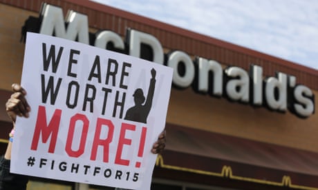 People take part in a demonstration to raise the minimum wage outside of McDonald’s corporate headquarters in Chicago on 15 January. Photograph: Scott Olson/Getty Images