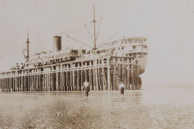 The MV Koolinda docked in low tide at Broome in March 1931.