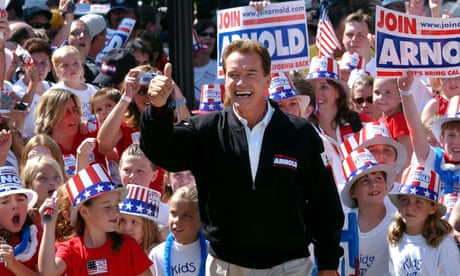 Arnold Schwarzenegger talks to reporters as he leaves the Los Angeles county registrar’s office carrying the papers needed to run for governor, in 2003. Photograph: Lee Celano/AP