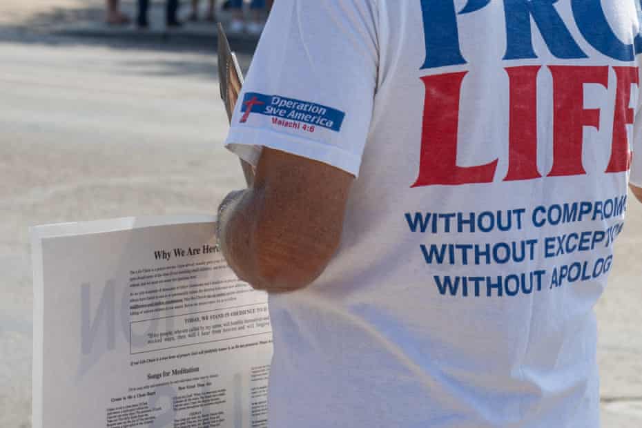 A member Operation Save America protests against abortion outside Camelback Family Planning in Phoenix on 24 June. Photograph: Caitlin O'Hara/The Guardian