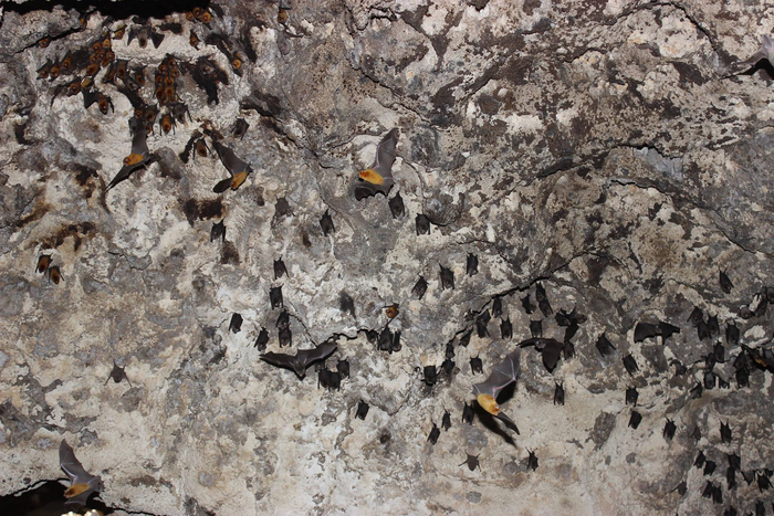 Natal and African long-fingered bats (Miniopterus natalensis, M. africanus), Mauritian tomb bats (Taphozous mauritianus), and Noack's roundleaf bats (Hipposideros ruber) roosting together in a fossilized coral cave in Arabuko Sokoke Forest, Kenya.