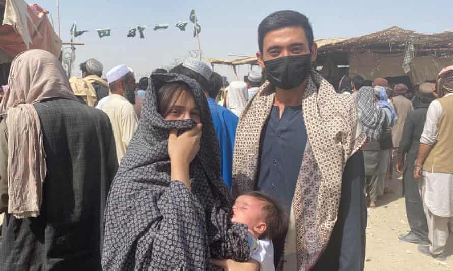 Sher Ali with his wife and small baby who fled Kabul and reached Chaman, Pakistan on Thursday. Photograph: Shah Meer Baloch