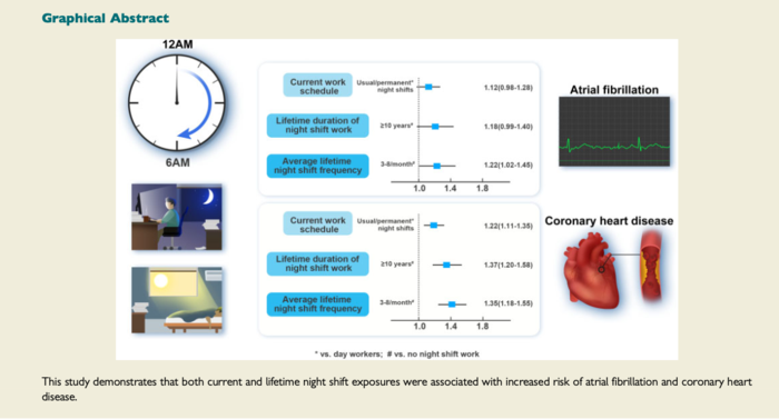 IMAGE: THIS STUDY DEMONSTRATES THAT BOTH CURRENT AND LIFETIME NIGHT SHIFT EXPOSURES WERE ASSOCIATED WITH INCREASED RISK OF ATRIAL FIBRILLATION AND CORONARY HEART DISEASE. view more