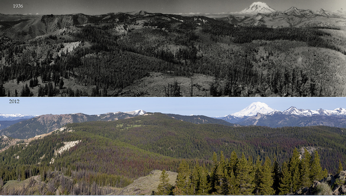 These two images show the same landscape in Washington state – the top taken in 1936 and the bottom in 2012. The top photo shows a landscape with less tree cover, maintained naturally through frequent historical wildfires. The bottom photo shows how forest cover has densified and expanded in the same area under policies of fire exclusion.