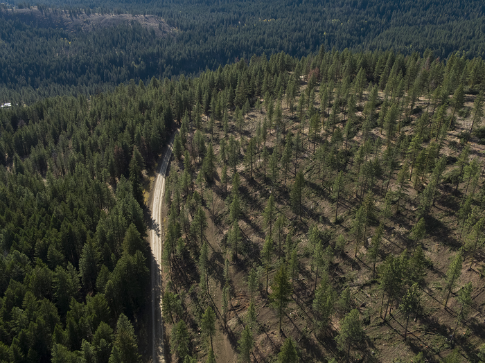 An aerial photo showing untreated forestland (left) across the road from an area that has been thinned (right).