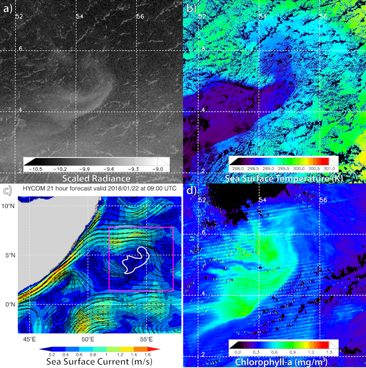 Researchers found a milky sea event off the coast of Somalia, seen here as a pale swoosh in the top left image. The other panels show sea surface temperature, ocean currents and chlorophyll. Steven D. Miller/NOAA