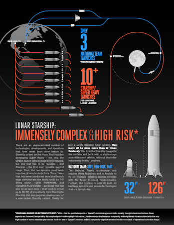 HERE’S THE BACKGROUND — “Lunar Starship: Immensely Complex and High Risk” is the large font headline of the Blue Origin infographic, which goes on to list the reasons the company believes NASA’s choosing SpaceX to build a lunar lander was a bad decision.