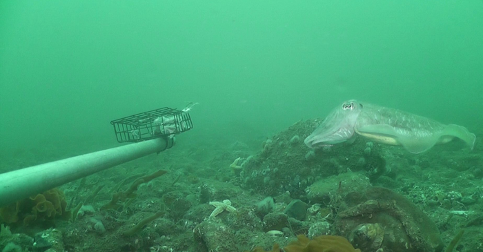 IMAGE: A CUTTLEFISH (SEPIA OFFICINALIS) APPROACHES ONE OF THE BAITED CAMERA SURVEYS CARRIED OUT BY RESEARCHERS IN THE LYME BAY MARINE PROTECTED AREA view more