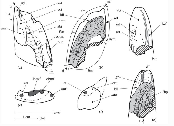 Peer-Reviewed PublicationIMAGE: MORPHOLOGICAL INTERPRETATION OF MANDIBULAR AND PALATINE TOOTH PLATES OF MOSKOVIRHYNCHUS ROBUSTUS GEN. ET SP. NOV. AND TERMINOLOGY USED IN TEXT; (A–C) SGU, NO. 155/65, RIGHT MANDIBULAR (L18, LS3.2) PLATE: (A) SYMPHYSEAL-OCCLUSAL VIEW, (B) BASAL VIEW, (C) LINGUAL CROSS-SECTION; MOSCOW, KUNTSEVO; UPPER JURASSIC, MIDDLE VOLGIAN, VIRGATUS ZONE; (D–E) SGU, NO. 155/66, LEFT PALATINE (L19.8) PLATE: (D) OCCLUSIVE VIEW, (E) BASAL VIEW, (F) LINGUAL CROSS-SECTION; MOSCOW REGION, LOPATINSKY PHOSPHORITE MINE NO. 7-2-BIS; UPPER JURASSIC, MIDDLE VOLGIAN, ?VIRGATUS ZONE. ABBREVIATIONS: DAMAGED SURFACES AND PARTS OF THE PLATE CROSS-HATCHED; VASCULAR PLEROMIN OF TRITORS STIPPLED; LAMINAR PLEROMIN IN GREY; ORIENTATION OF MISSING PARTS OF TOOTH PLATES AS DOTTED LINE. ABBREVIATIONS: (’), INT’, SYT’ ETC. PLEROMIN BODIES OF THE CORRESPONDING TRITORS IN LINGUAL CROSS-SECTION; ABT, ABORAL PART OF THE PLATE; DA, DISTAL ANGLE; FBP, FIELD OF BASAL PERFORATION (LIGHT GREY FILL); IBMT, INNER BRANCH OF MEDIAN TRITOR; INT, INNER TRITOR; L, MESIODISTAL LENGTH; LAM, LABIAL MARGIN; LDL, LATERAL DESCENDING LAMINA; LGR, GROWTH LINES ON THE SURFACE OF “COMPACT GLOSSY TISSUE”, LIM, LINGUAL MARGIN; LS, LENGTH OF SYMPHYSEAL PLATFORM ON MANDIBULAR PLATE; LWF, LABIAL WEAR FACET; MA, MESIAL ANGLE; OBMT, OUTER BRANCH OF MEDIAN TRITOR; ORT, ORAL PART OF PLATE; OUT, OUTER TRITOR; SDL, SYMPHYSEAL DESCENDING LAMINA; SPL, SYMPHYSEAL SURFACE; SYM, SYMPHYSEAL MARGIN; UWS, UNWORN PART OF THE OCCLUSIVE SURFACE. view more