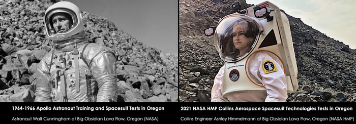 IMAGE: FIGURE 1: THE NASA HAUGHTON-MARS PROJECT RETURNS TO APOLLO ERA TRAINING AND SPACESUIT TESTING SITES IN OREGON. LEFT: APOLLO ASTRONAUT WALTER CUNNINGHAM IN A SPACESUIT FOR ANALOG STUDIES AT THE BIG OBSIDIAN LAVA FLOW, OREGON IN SEPTEMBER 1964. RIGHT: SPACESUIT ENGINEER ASHLEY HIMMELMANN IN A COLLINS AEROSPACE SPACESUIT FOR ANALOG STUDIES WITH INTEGRATED INFORMATION TECHNOLOGIES AND INFORMATICS SUBSYSTEM (IT IS) AT THE SAME LOCATION IN AUGUST 2021. view more