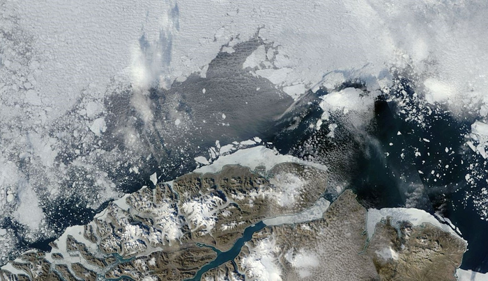 A polynya is a region of open water that is surrounded by sea ice. These areas fluctuate throughout seasons, and weather events can influence their size and development. Extremely high wind in February 2018 led to a polynya that developed in the Wandel Sea off the coast of Greenland. Climatologists have never observed such a pronounced polynya since the beginning of the satellite era. Then, six months later, in August 2018, a polynya appeared again. A team of scientists, wanting to learn more about this unusual event, applied a comprehensive dataset to investigate the effects of atmosphere, sea ice, and ocean on the August polynya formation.