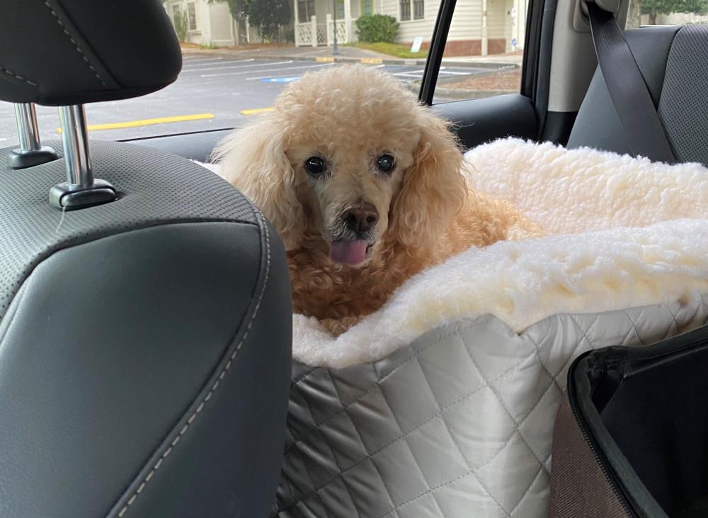 Timmy, a rescue poodle owned by Linda Sheffield, appears in her car in Marietta, Ga., on Oct. 12, 2020. Timmy died this year after Sheffield consulted an animal communicator, who told her the dog was gravely ill. (Linda Sheffield via AP)