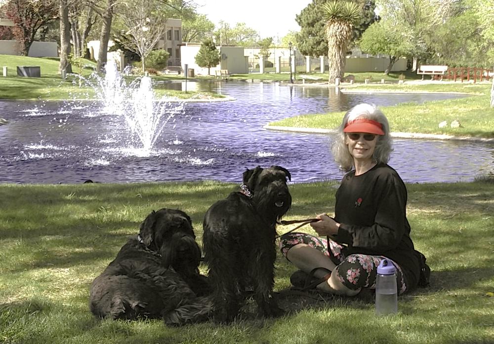 Penny Wagner appears with her two dogs, Clarence, left, and Cooper in Albuquerque, N.M., on April 8, 2020. Clarence died peacefully March 9 after Wagner and her husband hired a private service that provides home euthanasia for pets. (Steve Wagner via AP)