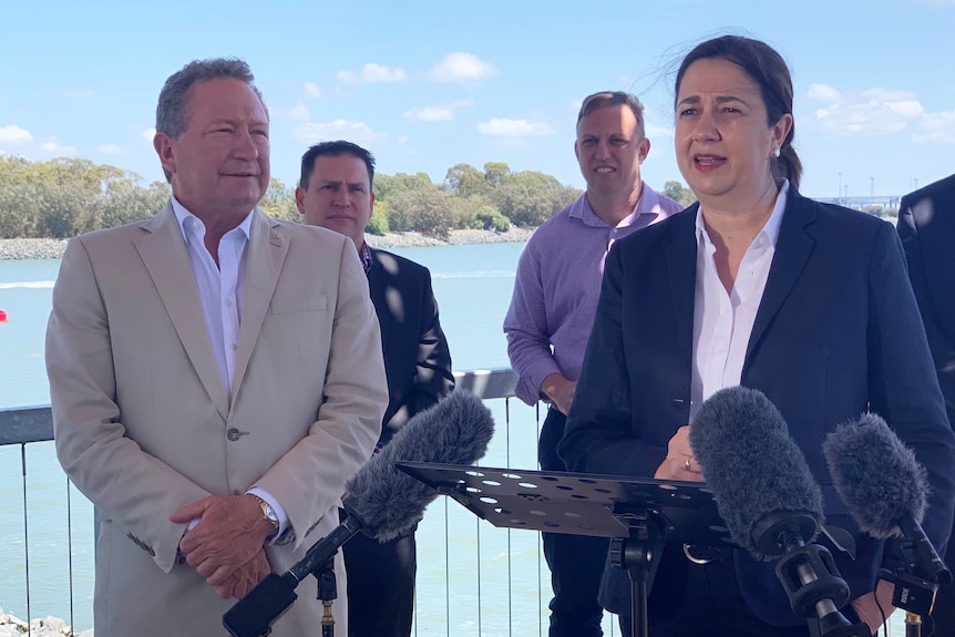 Fortescue Future Industries founder Dr Andrew Forrest and Queensland Premier Annastacia Palaszczuk announcing the project in Gladstone.