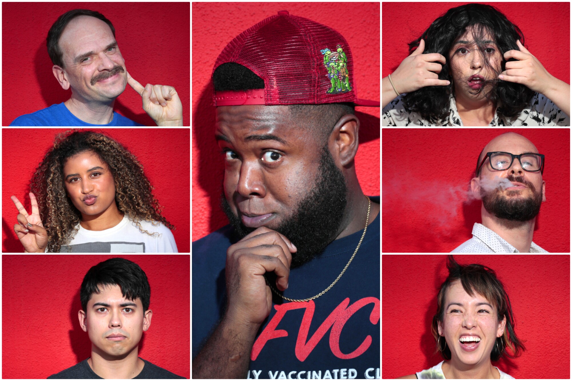 Comedy Co-op is a new endeavor formed by a group of local improvisers in the wake of numerous L.A. clubs foundering or shutting down during the pandemic. Among the comedians, clockwise from top left, David Theune, Leonard Smith Jr., Jessica “JZ” Zepeda, James Mastraieni, Nicole Pasquale, PJ McCormick and Paige Elson.