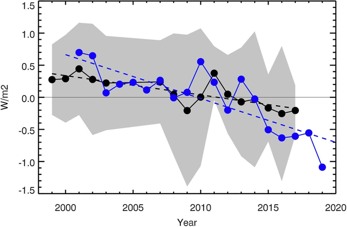 Peer-Reviewed PublicationIMAGE: EARTHSHINE ANNUAL MEAN ALBEDO 1998–2017 EXPRESSED AS WATTS PER SQUARE METER (W/M2). THE CERES ANNUAL ALBEDO 2001–2019, ALSO EXPRESSED IN W/M2, ARE SHOWN IN BLUE. A BEST FIT LINE TO THE CERES DATA (2001–2019) IS SHOWN WITH A BLUE DASHED LINE. AVERAGE ERROR BARS FOR CERES MEASUREMENTS ARE OF THE ORDER OF 0.2 W/M2. view more