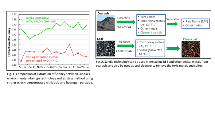 The Sandia process, which uses citric acid as a carrier for rare-earth metals, so they separate from coal ash, the host material, was implemented by Xu. The extraction process is facilitated by using supercritical carbon dioxide solvent. Xu’s Sandia colleague Yongliang Xiong suggested citric acid, a commonly used and environmentally friendly chemical for holding metals in solution.