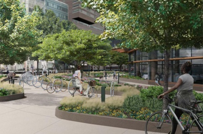 The facility’s eco-friendly finishes extend to enabling green transit options for the thousands who will work and visit the Pavilion each day. In the 690-space underground parking garage, 2 percent of parking spaces have access to electric vehicle recharging stations, and to promote cycling and walking, 352 new bicycle parking spots have been installed at various locations surrounding the Pavilion. A new pedestrian pathway connecting the facility to Penn Medicine Station makes for easily accessible train travel for staff and visitors who use public transportation.