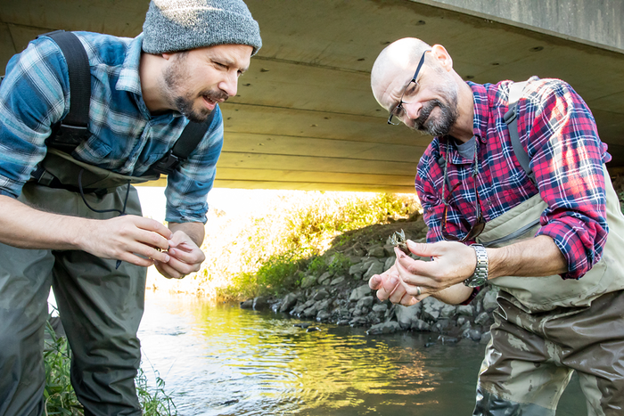 IMAGE: CHRISTOPHER TAYLOR, LEFT, ERIC LARSON AND THEIR COLLEAGUE ZACHARY ROZANSKY, NOT PICTURED, REPORT THAT AN INVASIVE CRAYFISH IS INTERBREEDING WITH A NATIVE SPECIES IN THE CURRENT RIVER IN MISSOURI. view more