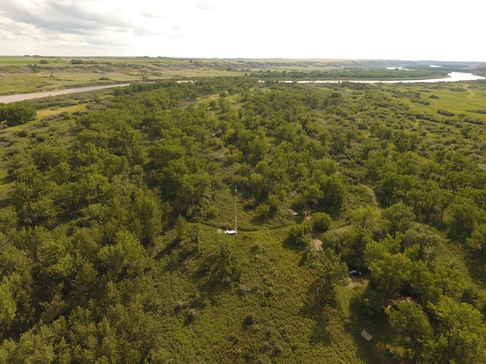 A cottonwood forest adjacent to the Red Deer River in Alberta, Canada. In a 2021 study, researchers present new techniques for modeling the impact of climate change on riparian forests of this kind. Visible in the photo is an eddy covariance flux tower — a type of scientific installation that was used in the new study.