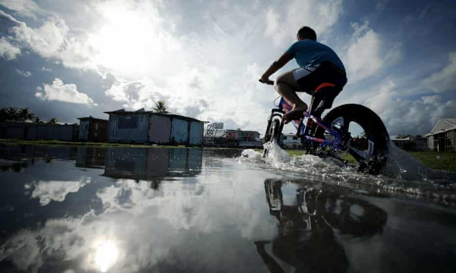 A boy rides through floodwaters near high tide in a low-lying area of Tuvalu, in the South Pacific. Pacific island leaders have expressed disappointment at the Cop26 climate summit’s outcome. Photograph: Mario Tama/Getty Images