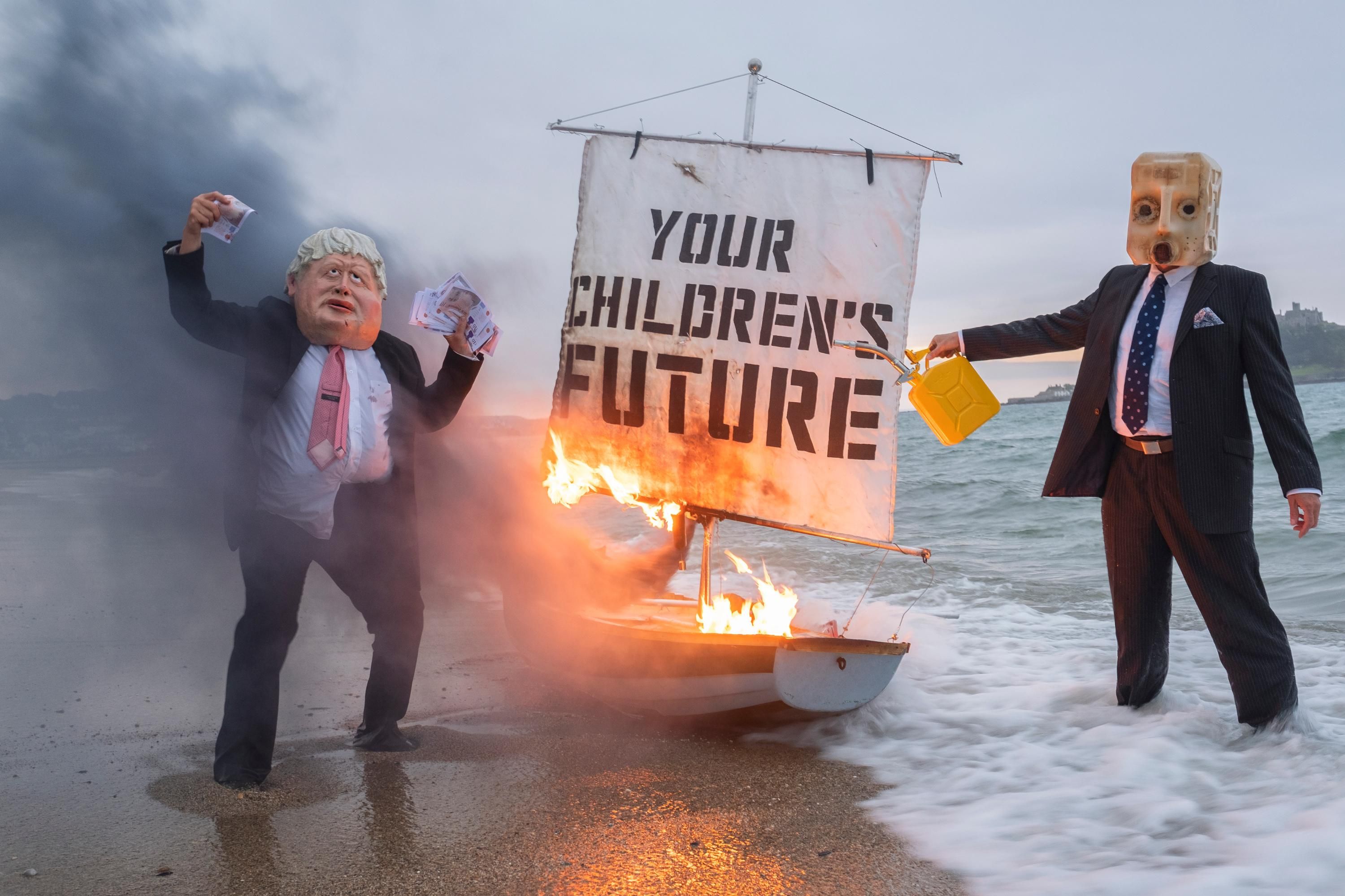 Ocean Rebellion staged a theatrical action with a Boris Johnson head and an "Oil head" burning a boat on Marazion beach on June 5, 2021 in Cornwall, United Kingdom.