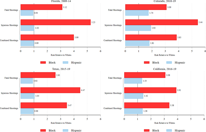 They found that Black civilians were more likely than white civilians to be nonfatally shot and injured in each state, and that these disparities were greater than seen for fatal shootings. For instance, from 2016 to 2019, Black people in California were 3.91 times more likely than white people to be nonfatally shot, and 3.08 times more likely to be fatally shot.