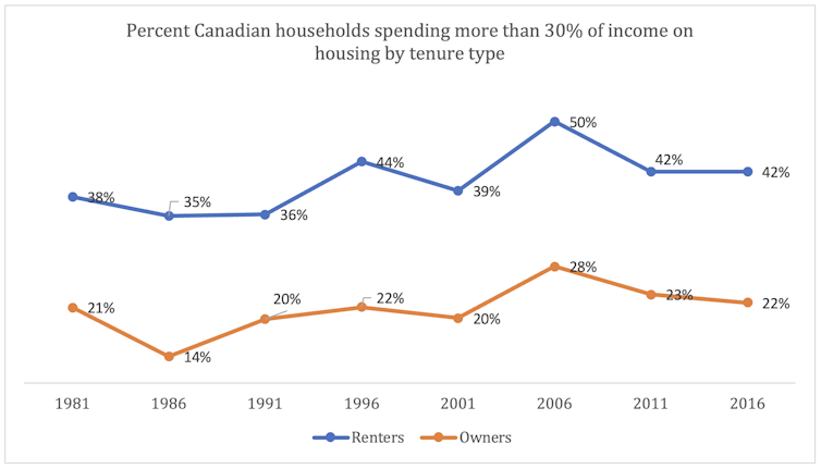 Chart showing the share of renter and owner households that spend more than 30 per cent of income on housing. (Statistics Canada)