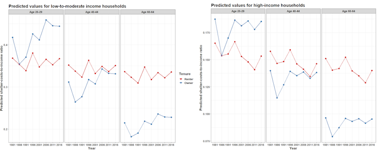 Chart showing predicted shelter-costs-to-income ratio by age, tenure and income, 1981-2016. Low-income renters and low-income young homeowners are disproportionately impacted by rising housing unaffordability. (Author provided)