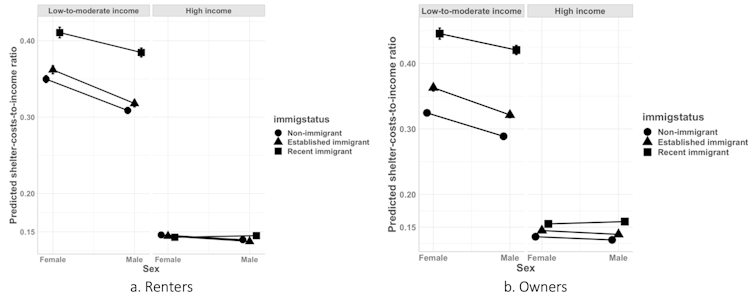 Chart demonstrating predicted shelter-costs-to-income ratio in 2016 by sex, income and immigrant status for renters (a) and owners (b). Low-income recent immigrants and low-income female-led households are disadvantaged in affordable housing access. (Author provided)