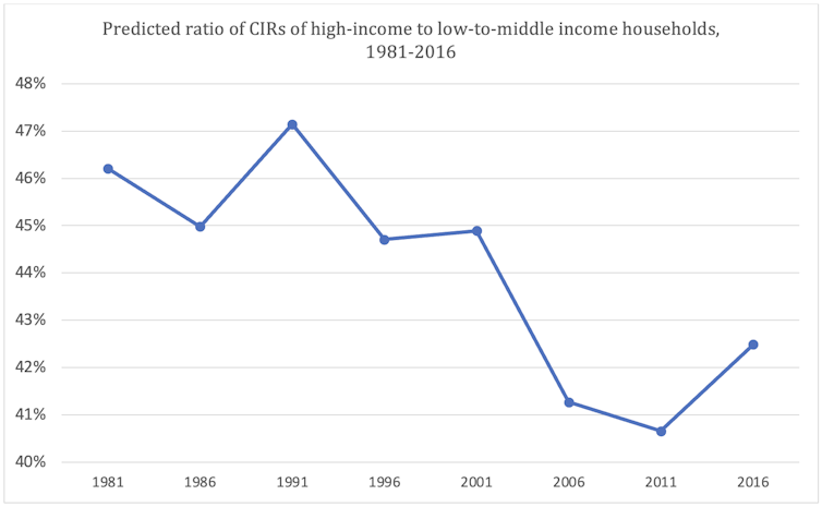 After taking factors such as household type and size and socio-demographic characteristics into consideration, we estimated that the average CIR for high-income households dropped from 46 per cent for low to middle-income income households, to 40 per cent post-2001. This suggests a greater gap in accessing affordable housing determined by income, and a more commodified housing sector in the neoliberal era.