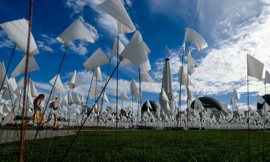 A Covid-19 memorial made of white flags representing lives lost to coronavirus is seen in Los Angeles. Photograph: Ringo Chiu/Zuma Press Wire/Rex/Shutterstock