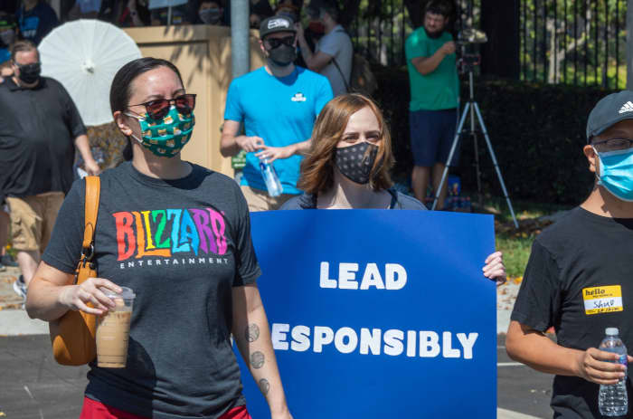 Microsoft’s proposed acquisition of Activision Blizzard is raising further concerns about the videogame company’s workplace culture. Last July, Activision employees walked out to denounce the company’s response to a California lawsuit over sexual harassment and discrimination charges. AFP VIA GETTY IMAGES