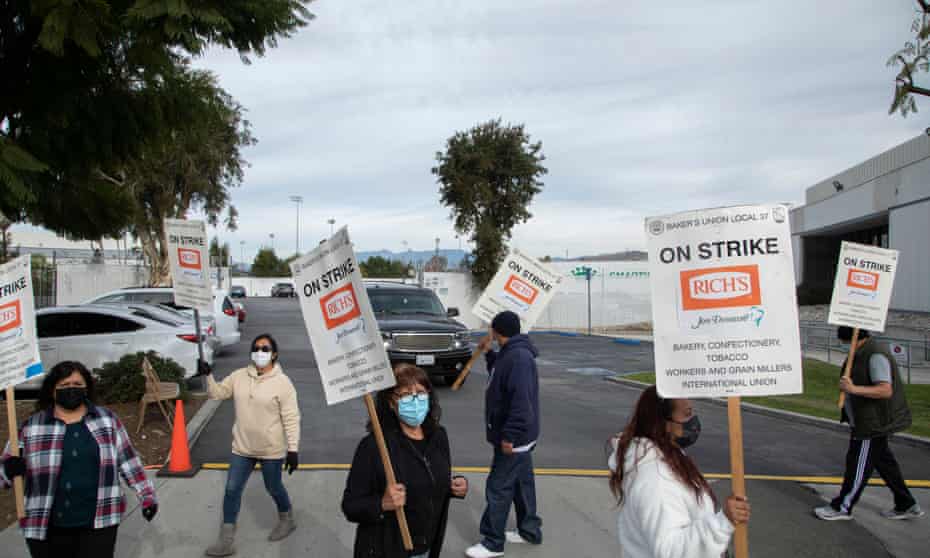 Striking workers at the Jon Donnaire Desserts plant in Santa Fe Springs. In the first year of the pandemic, Rich Products, which owns the plant, reported more than $4bn in revenue.
