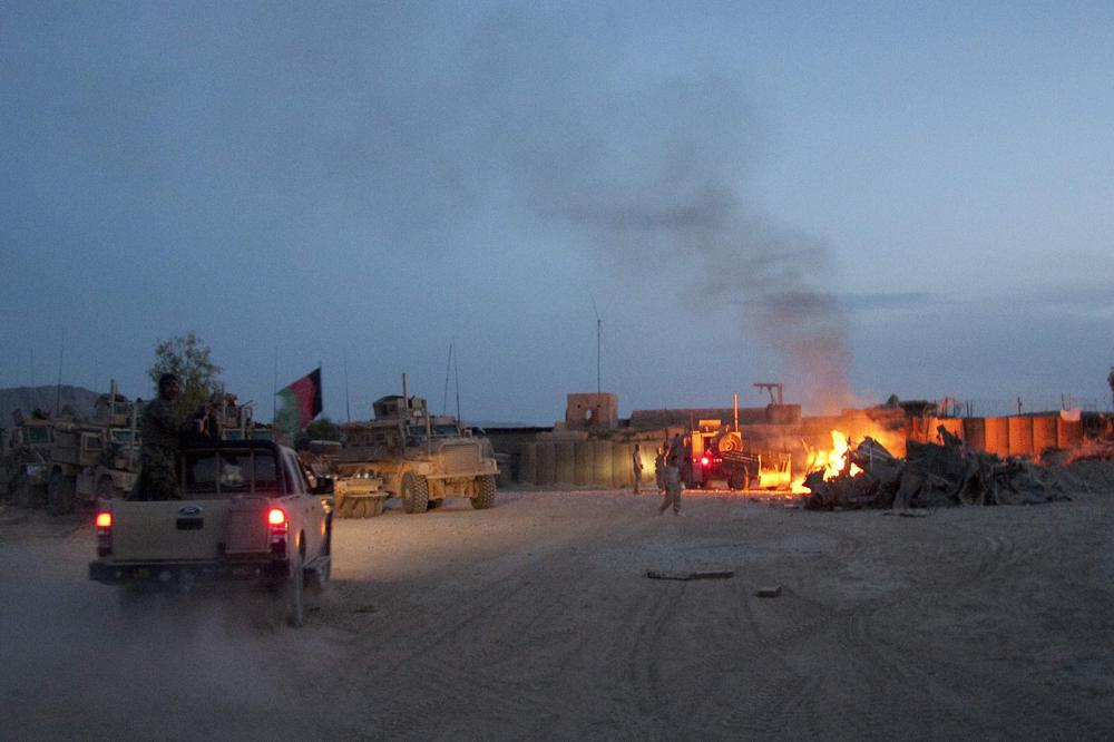 In this April 28, 2011, photo, an Afghan National Army pickup truck passes parked U.S. armored military vehicles, as smoke rises from a fire in a trash burn pit at Forward Operating Base Caferetta Nawzad, Helmand province south of Kabul, Afghanistan. The House is poised to pass legislation that would dramatically boost health care services and disability benefits for veterans exposed to burn pits in Iraq and Afghanistan. (AP Photo/Simon Klingert, File)