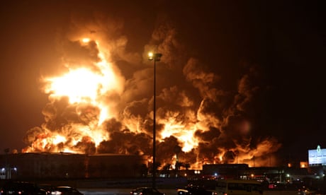 Smoke and flames rise from an oil facility near to the F1 circuit in the Saudi Arabian city of Jeddah after it was hit and set ablaze by a Houthi missile attack