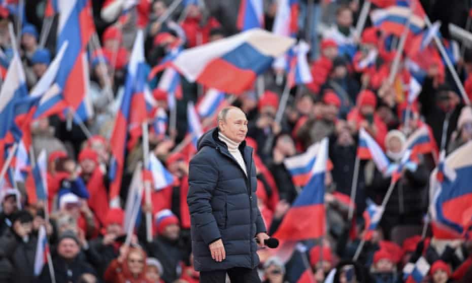 As the Guardian reported, Putin spoke from a stage featuring slogans such as “For a world without Nazism” and “For our president”, and told “a large flag-waving crowd” Russia “hasn’t seen unity like this in a long time”.