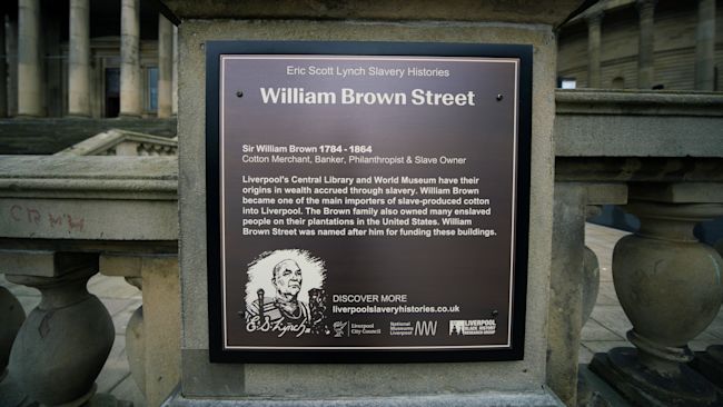 The plaque tells the history of William Brown, a slaver who lived in Liverpool.